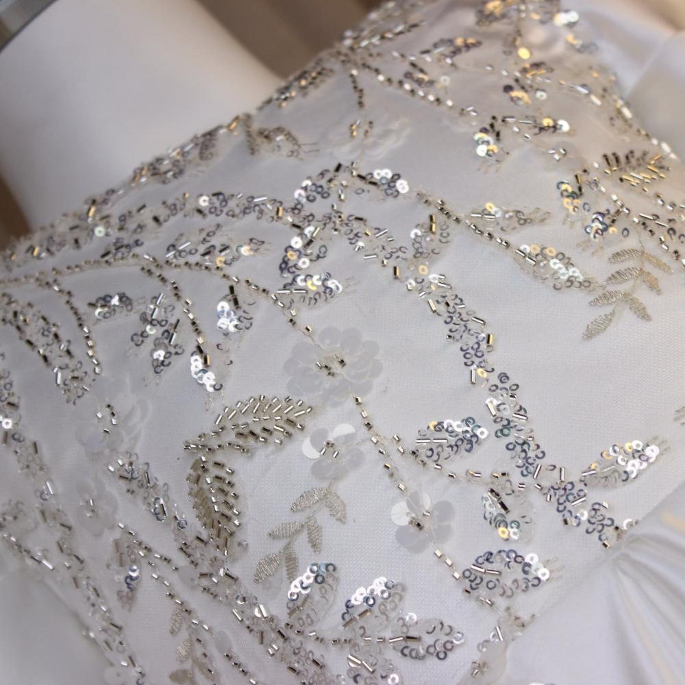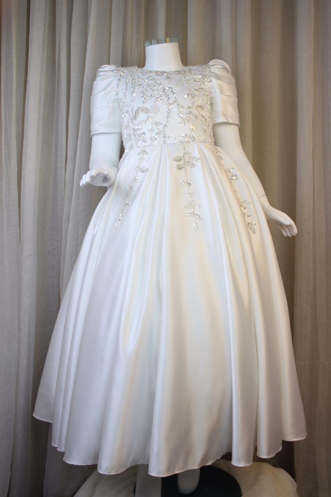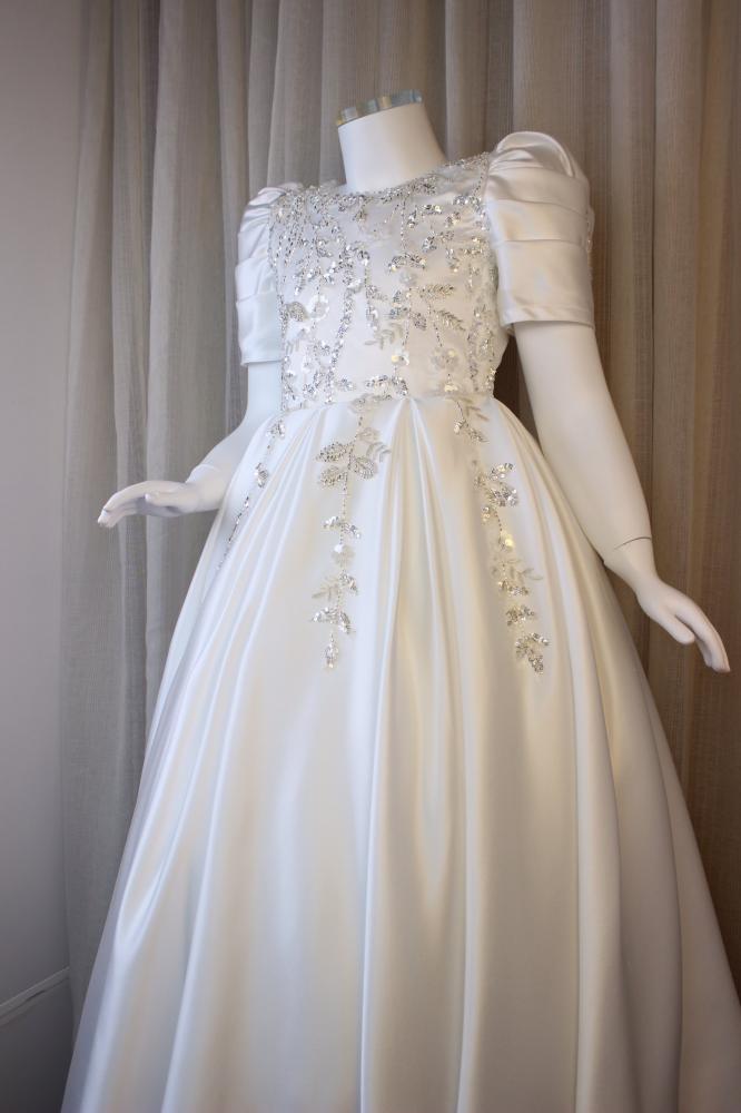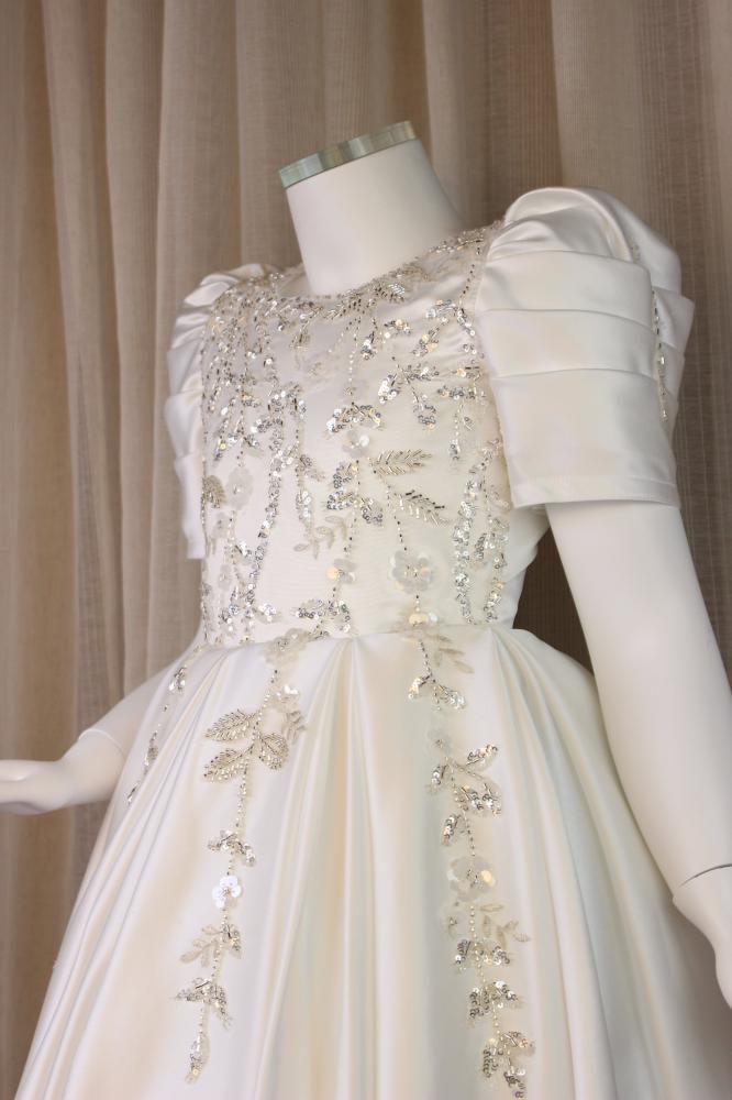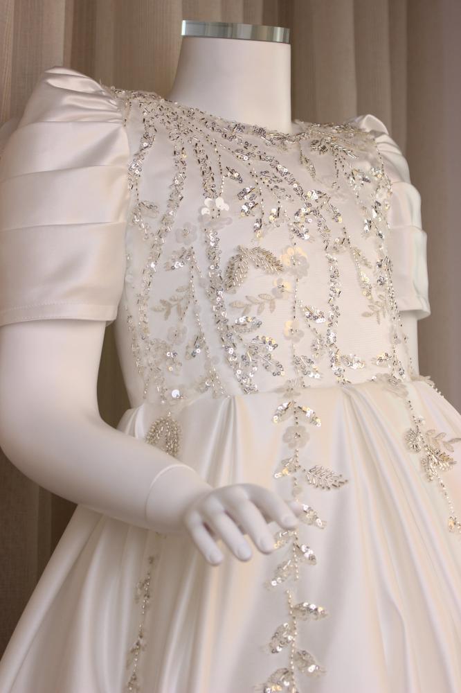 فستان بناتي سهرة سكري قماش تفته بأكمام بف مطرز بالكرستال